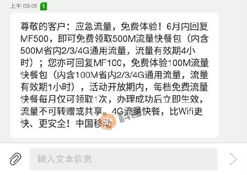 相信不少广东的朋友今天早上都接到了移动客服的一条短信,称从本月开始,只需回复“MF500”至10086,就能免费获得500MB流量,而且是2G/3G/4G通用的。